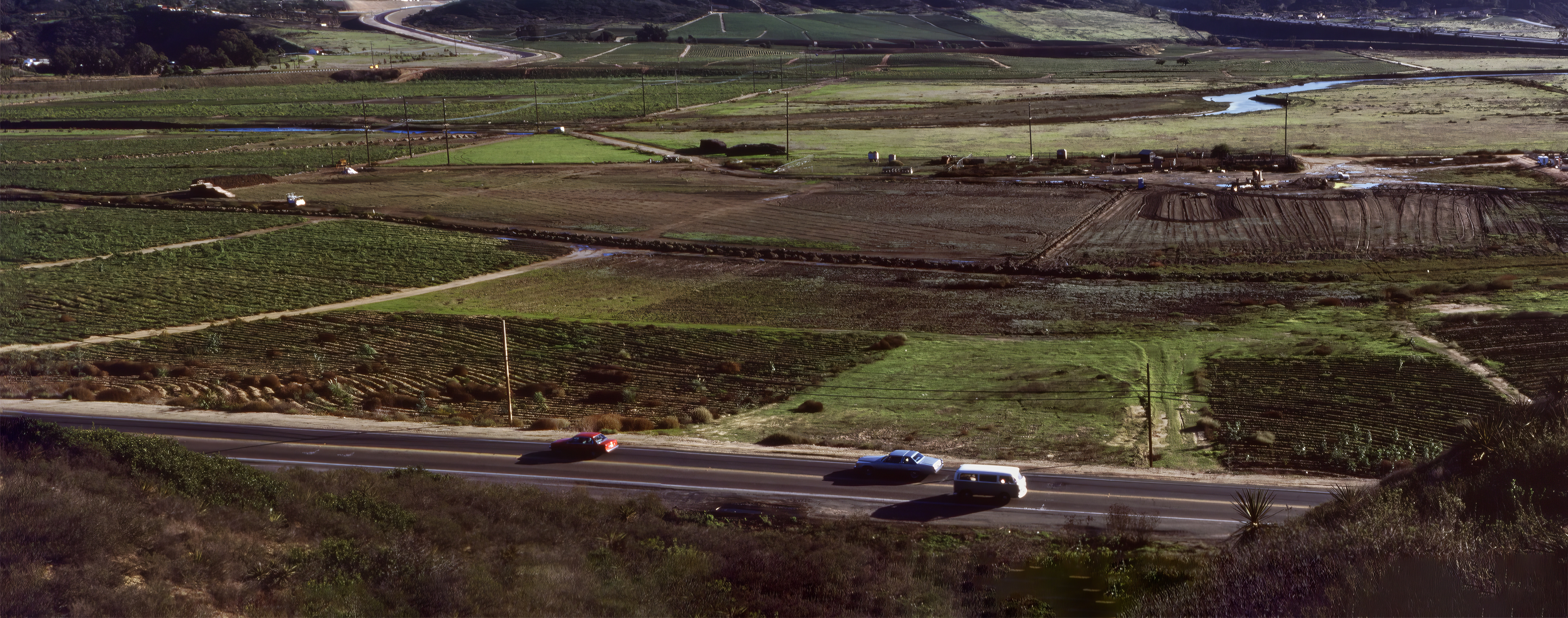A recent aerial view looking west (below) shows the entire restored tidal channel and saltwater wetlands enclosed by newly planted berms that parallel the San Dieguito River channel to the north. Most of the reclaimed river valley was once a maze of tomato and bean fields as seen in a view looking south over the same area in 1987 (bottom photo).
